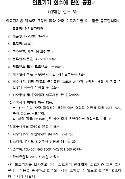 | [2020년] 의료기기 회수에 관한 공표 | |||||