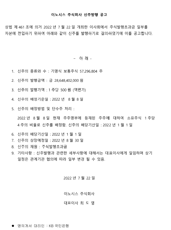 [2022년] 이노시스 주식회사 신주발행 공고